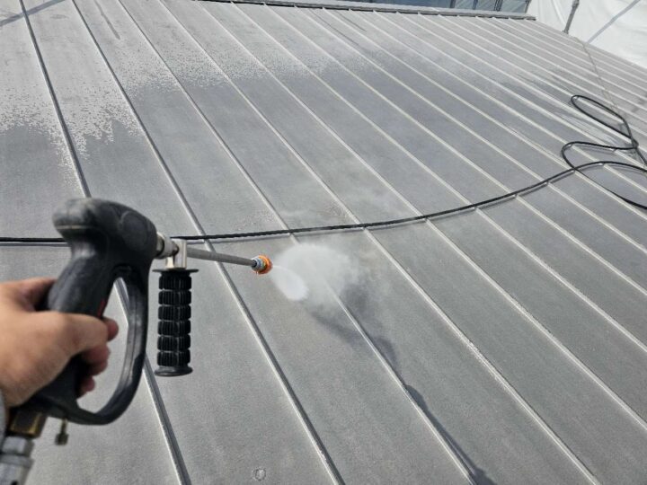 屋根の高圧洗浄を行います。高圧洗浄を行う事で付着したコケや汚れなどを落とし、塗料の密着を良くします。