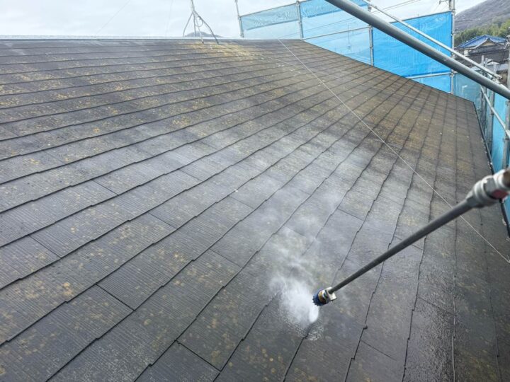 屋根の高圧洗浄を行います。高圧洗浄を行う事で付着したコケや汚れなどを落とし、塗料の密着を良くします。
