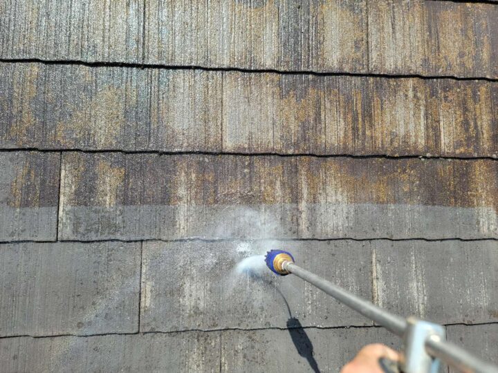 屋根の高圧洗浄を行い、コケや藻などの汚れを落としていきます。