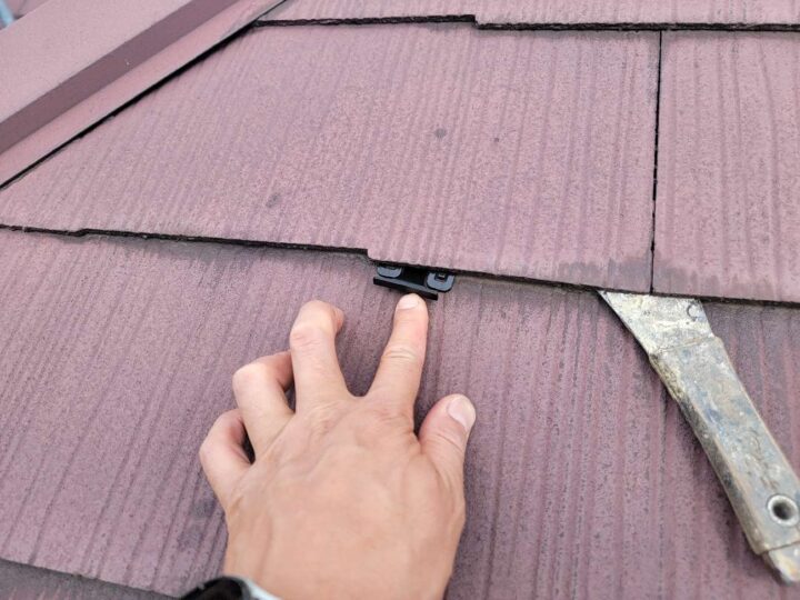 屋根の高圧洗浄を実施後、屋根間の必要な隙間を確保する為に、タスペーサー挿入を行います。